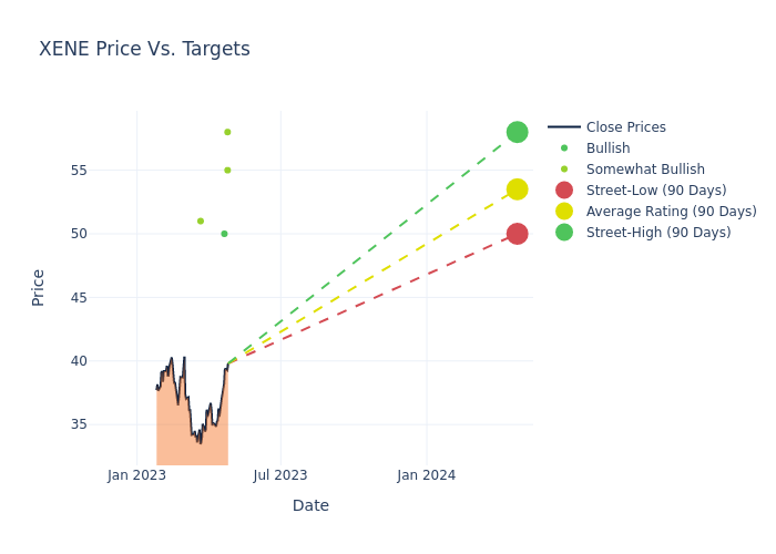According to 6 analyst offering 12-month price targets in the last 3 months, Xenon Pharmaceuticals has an average price target of $52.5 with a high of $58.00 and a low of $50.00.